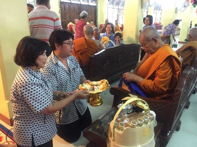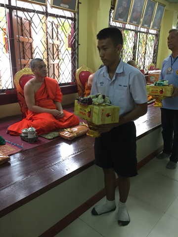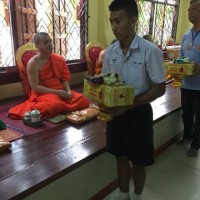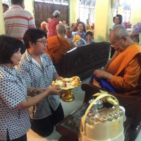 ตัวแทนท่านผู้อำนวยการถวายเครื่องไทยธรรมแด่พระคุณเจ้า วัดเขมาภิรตารามที่เมตตามาเดืนทางมาร่วมพิธีสวดมนต์เย็นเปิดงานประจำปีวัดท่าบันเทิงธรรม |