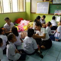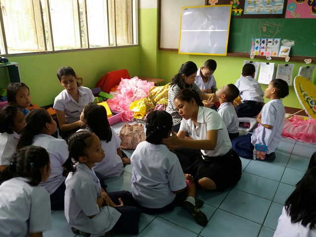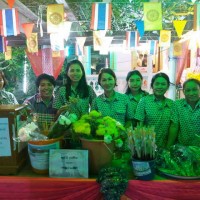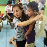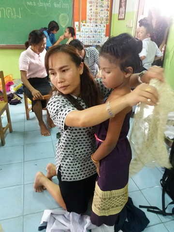 คณะครูร่วมกันแต่งกายชุดการแสดงของนักเรียนในงานประจำปีวัดท่าบันเทิงธรรม |