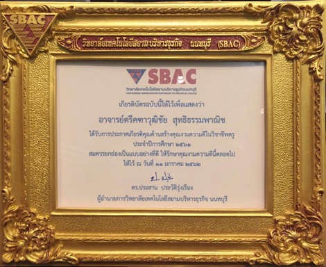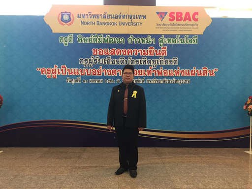 เมื่อวันศุกร์ที่ 11 มกราคม 2562 ตามวัตถุประสงค์ของมหาวิทยาลัยนอร์ทกรุงเทพ ได้จัดงานพิธีมอบเกียรติบัตรเชิดชูเกียรติ " ครูในดวงใจศิษย์" เนื่องในวันครูแห่งชาติครั้งที่ 15 โดยมีวัตถุประสงค์เพื่อเป็นการยกย่องผู้ประกอบวิชาชีพครู ทีทำงานด้วยความทุ่มเท เสียสละ ประสาทวิชาความรู้ให้ศิษย์ได้มีทักษะและความชำนาญในวิชาชีพ อบรม สั่งสอนให้เป็นคนดี และมีความสามารถอยู่ในสังคมไ้ด้อย่างมีความสุข ซึ่งในปีการศึกษา 2561 ผู้ที่ได้รับคัดเลือกคือ นายตรีคฑาวุฒิชัย สุทธิธรรมพาณิช เข้ารับเกียรติบัตรเชิดชูเกัยรติกับท่าน ฯพณฯ พลอากาศเอกชลิต พุกผาสุข องคมนตรี เมื่อวันศุกร์ที่ 11 มกราคม 2562 ณ ห้องประทุมรัตน์ มหาวิยาลัยนอร์ทกรุงเทพ |