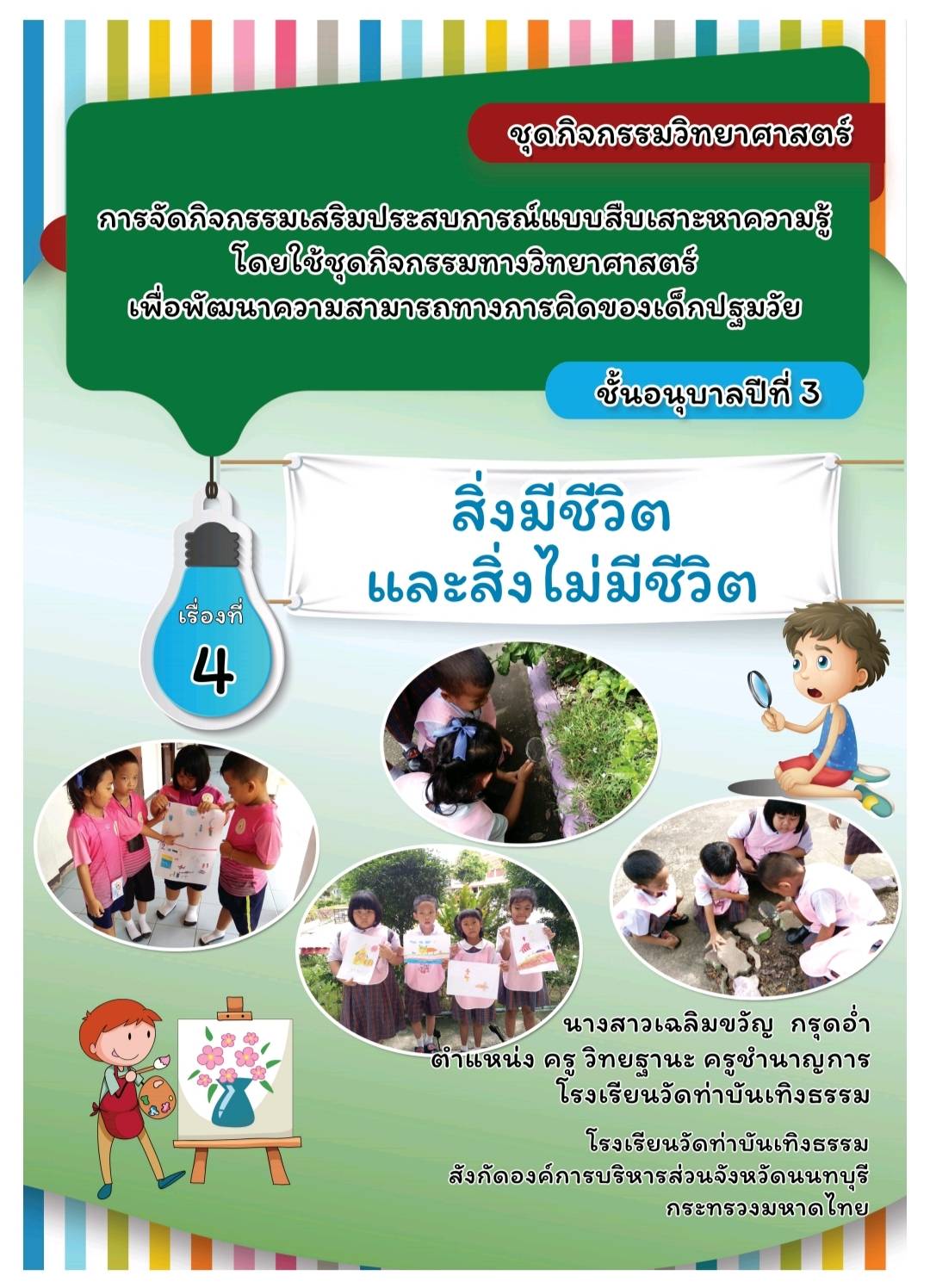 การจัดกิจกรรมเสริมประสบการณ์แบบสืบเสาะหาความรู้ โดยใช้ชุดกิจกรรมวิทยาศาสตร์ เพื่อพัฒนาความสามารถทางการคิด ของเด็กปฐมวัย ชั้นอนุบาลปีที่ 3 หน่วยที่ 4 สิ่งมีชีวิตและสิ่งไม่มีชีวิต