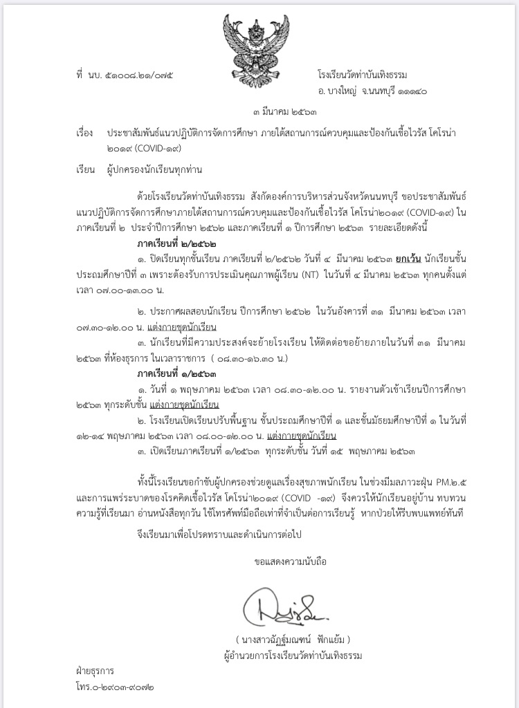 โคโรน่า2019 (COVID-19) ในภาคเรียนที่ 2 ประจำปีการศึกษา 2562 และภาคเรียนที่ 1